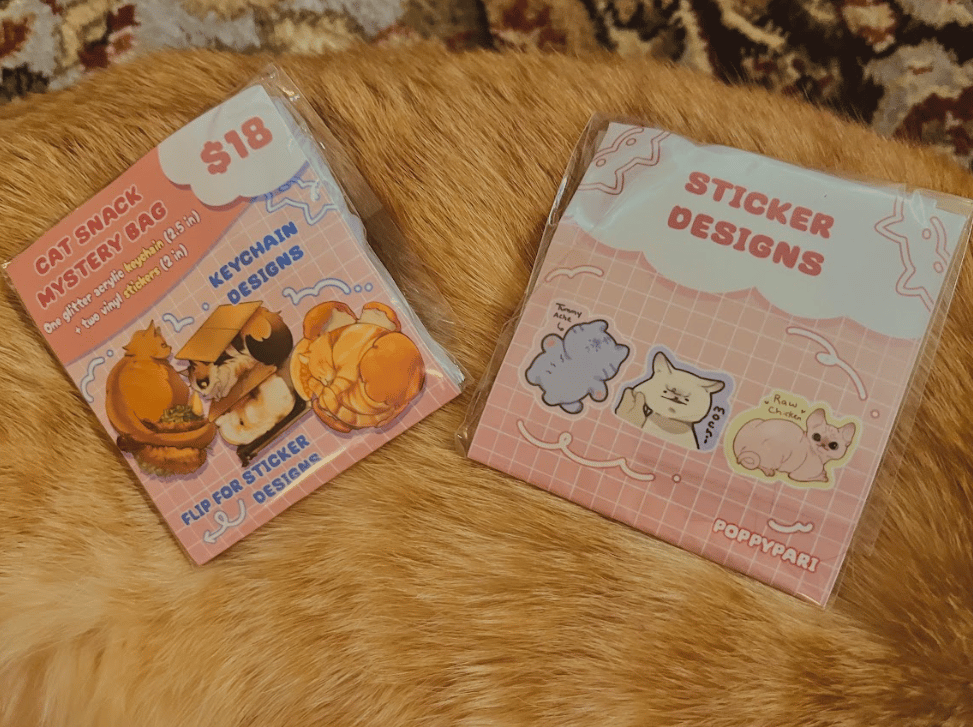 Keychains of cats, partially inspired by my own little guy, Scamp. Includes one glittery keychain as well as two stickers!